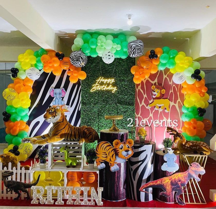 This is my most popular theme for kids' birthdays. I can create a variety of jungle looks, from cartoonish and friendly for toddlers to a more realistic safari style, all within a budget that works for you. Setups include animal cutouts, green and gold balloon arches, and themed backdrops.