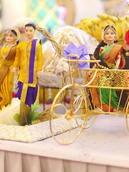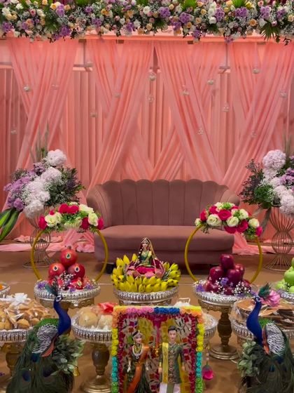 Signature plate displays with fresh fruits, sweets, and nuts, using both classic stands and sleek acrylic boxes. Traditional dolls and props like peacocks, cows, and brass lamps add real charm. Backdrops made with fresh flowers or banana leaves - perfect for rituals and snaps.