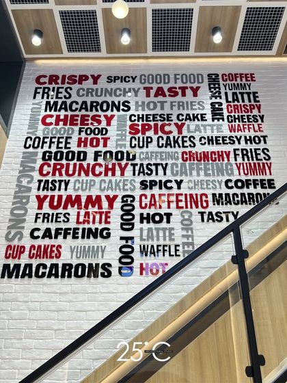 - Visuals: Large format vinyl wallpapers, typography, or internal neon flex signage.