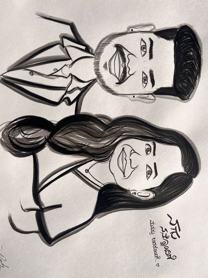 I create personalized digital caricature art using professional digital tools and software. My style features bold lines, exaggerated features, and intricate decorative elements that capture the subject's personality.