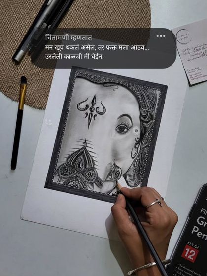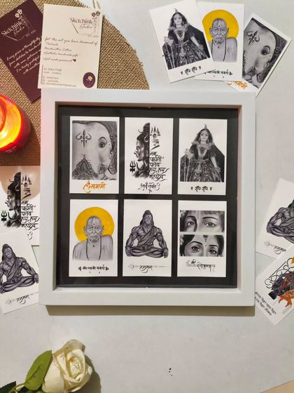 We make hand-drawn spiritual art prints and deity postcards in monochrome with gold accents, including Marathi calligraphy and handwritten messages for personal gifting or sacred decor.