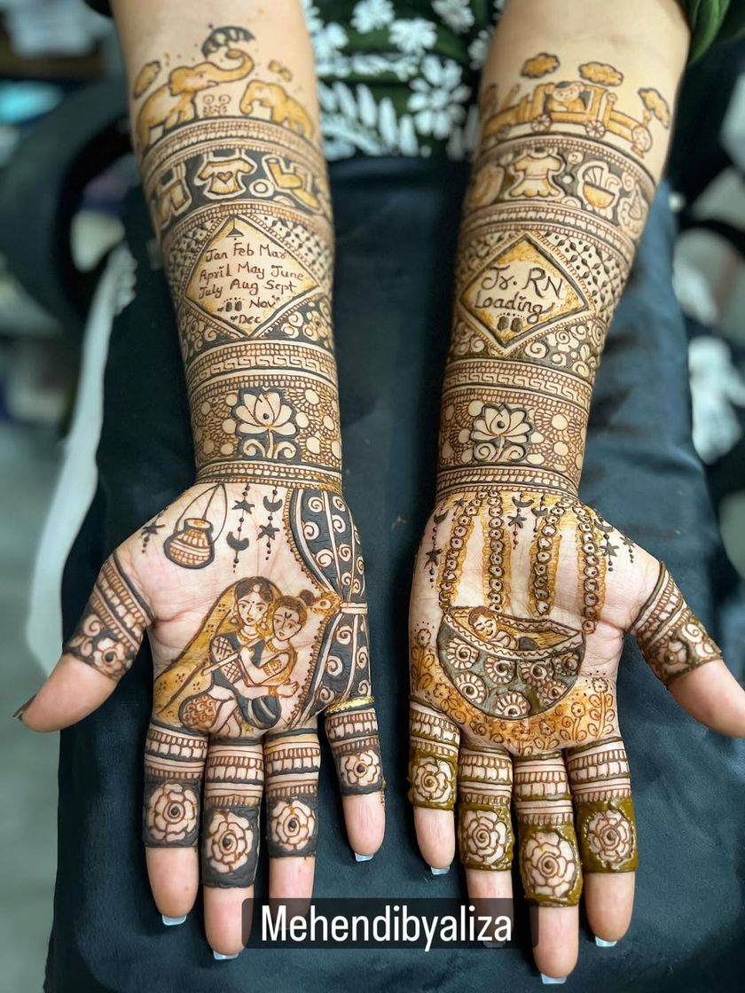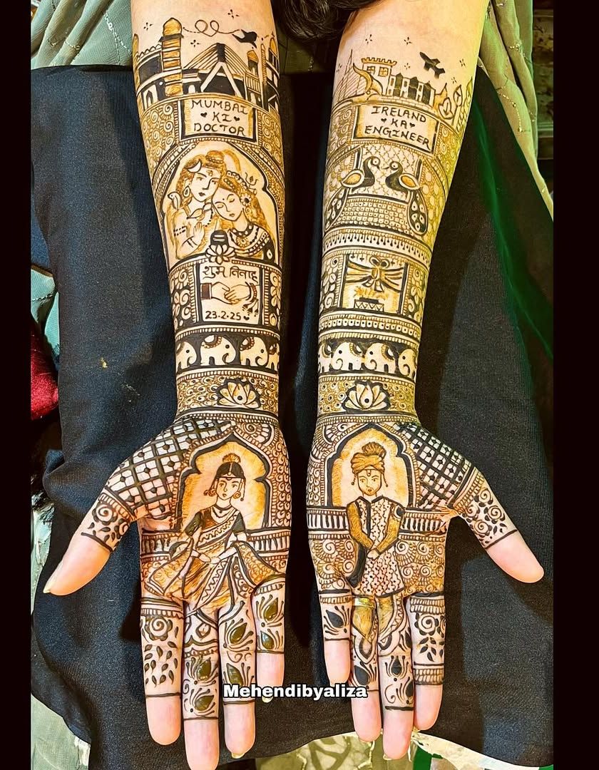 Your hands can tell your story. I specialize in creating personalized bridal mehendi that includes portraits of you and your partner, your pet, your wedding date, or symbols from your journey together. Let's make your bridal henna a true reflection of your unique love story.
