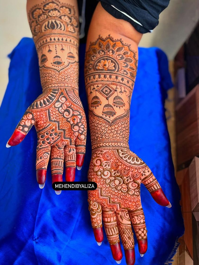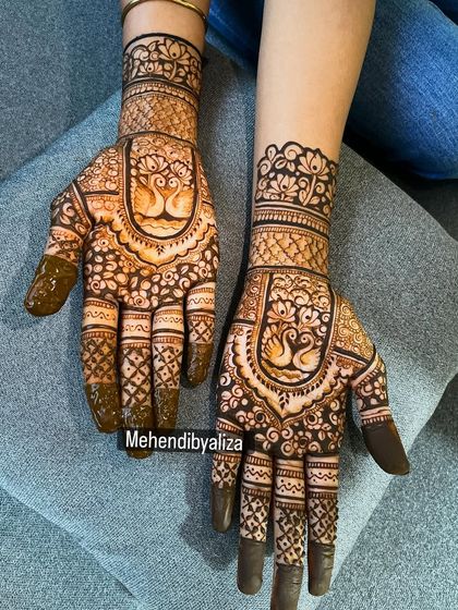 For brides who love classic beauty, I create full bridal and engagement designs that are rich in traditional motifs. From intricate peacocks and elephants to dense floral patterns and geometric grids, these *bhara hua* designs ensure your hands look absolutely stunning on your special day.