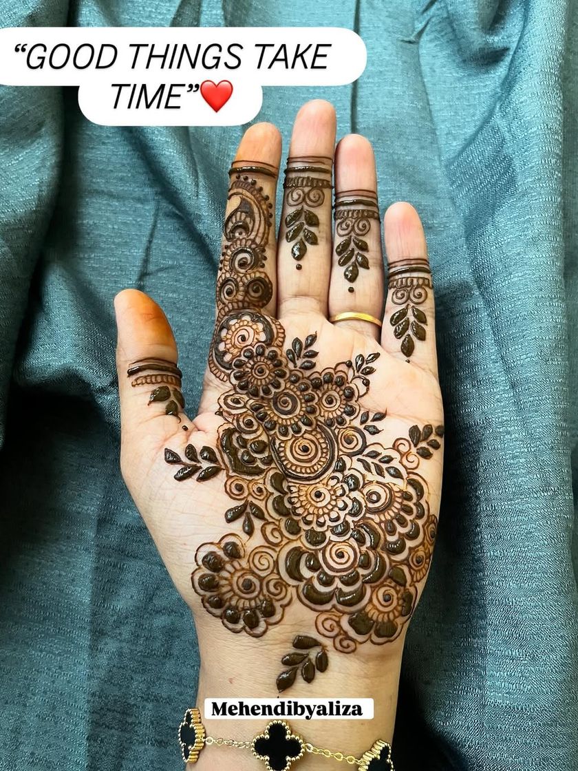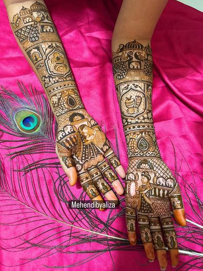 This is where I pour my heart out. See my detailed bridal and engagement work, featuring everything from traditional Rajasthani figures and delicate peacocks to modern symmetrical patterns. Each design is a unique masterpiece, crafted to tell your story on your big day.