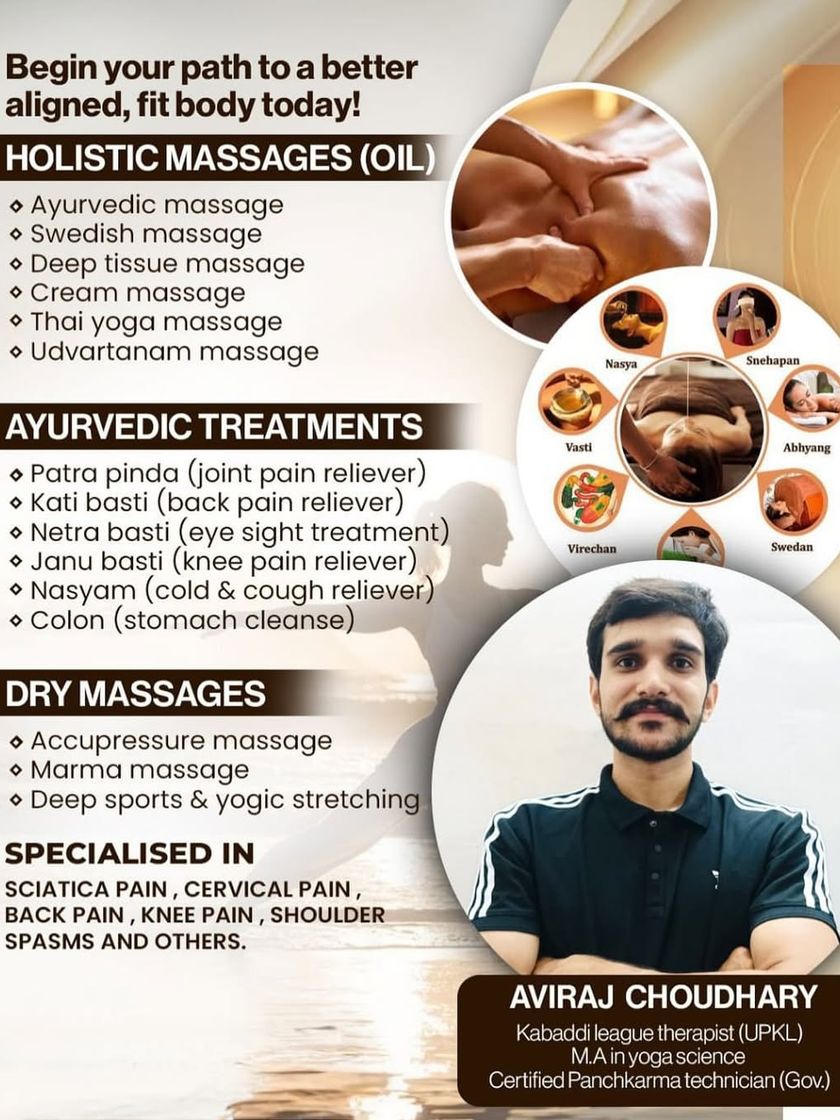 I bring traditional healing to your home, offering a range of oil-based and dry massages to relax the body and calm the mind. My services include Ayurvedic, Deep Tissue, and Thai Yoga massage, as well as specialized Panchkarma treatments like Kati Basti for pain relief.