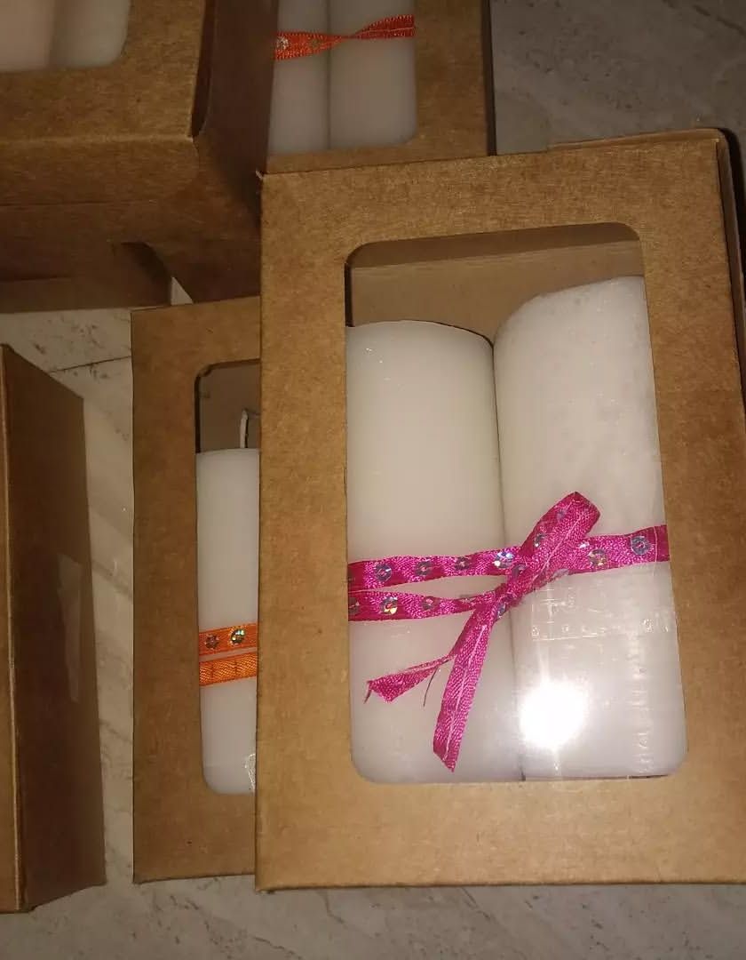 I offer simple and elegant packaging solutions to turn your candles into ready-to-give gifts. This includes options like these sturdy cardboard boxes with a clear window to display the candles inside.