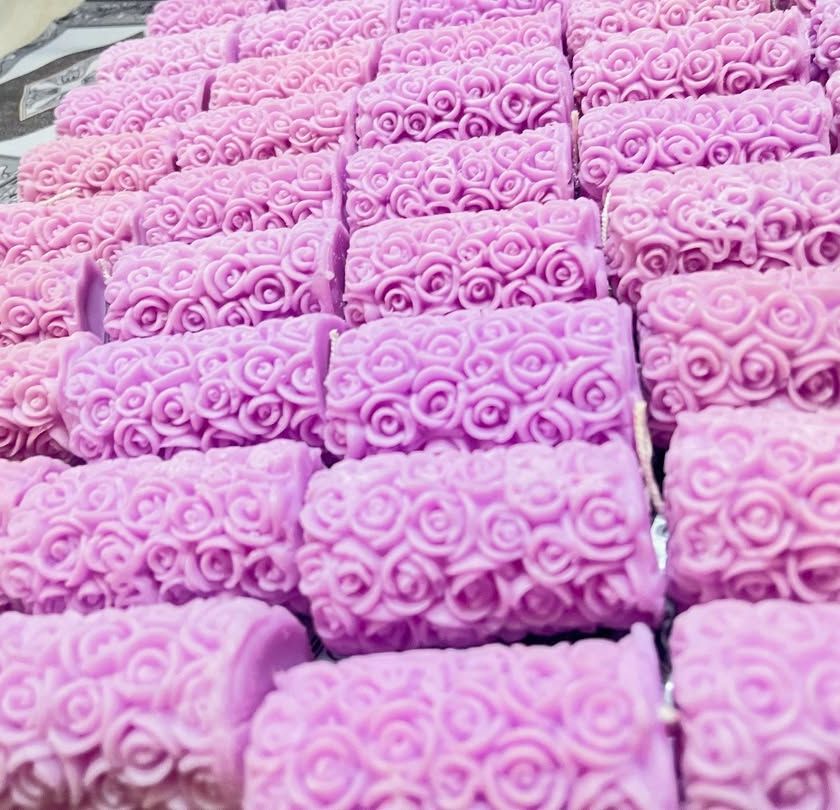 If you're looking for something different, I can create candles in various unique shapes and molds. This includes decorative styles like these rose-patterned candles, perfect for adding a special touch to your event favors.