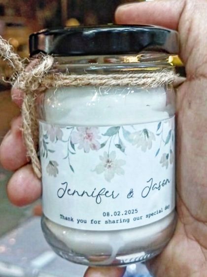 I create personalized scented candles that serve as unique return gifts for your wedding or anniversary guests. From custom labels on glass jars to elegant pillar candles, every piece is made to match your special day.