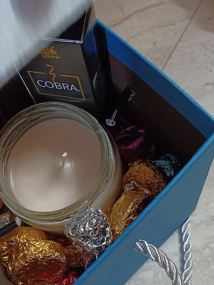 I make gift hampers with my handmade, customizable soy candles and extras like chocolates or perfume, packed and ready to gift for any occasion, even on short notice.