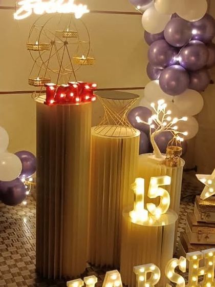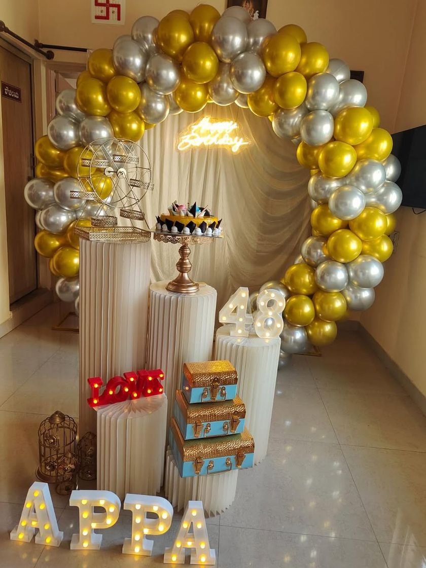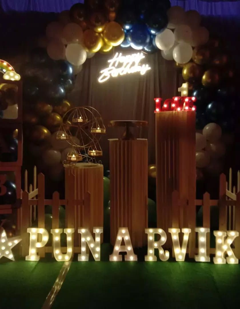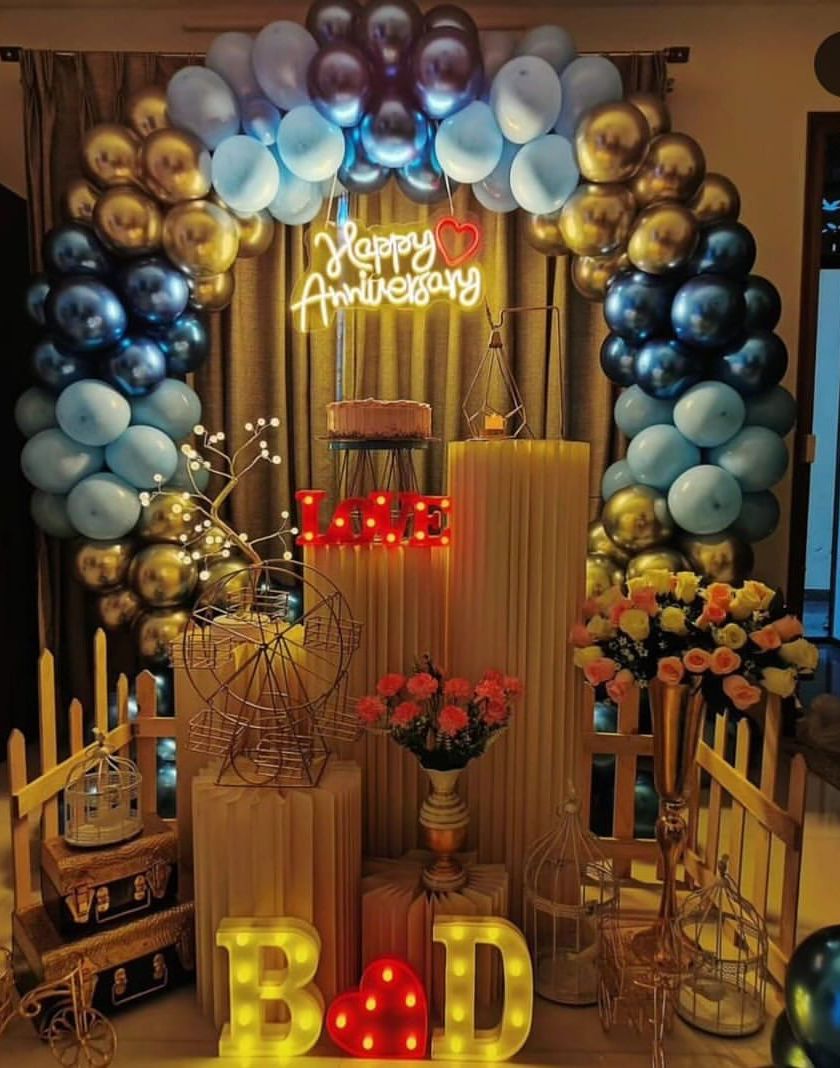 I design elegant and romantic decorations for anniversaries or to create a special surprise. These setups often feature "Happy Anniversary" neon signs, custom initial letters, and a mix of balloons and floral elements to set the perfect mood.