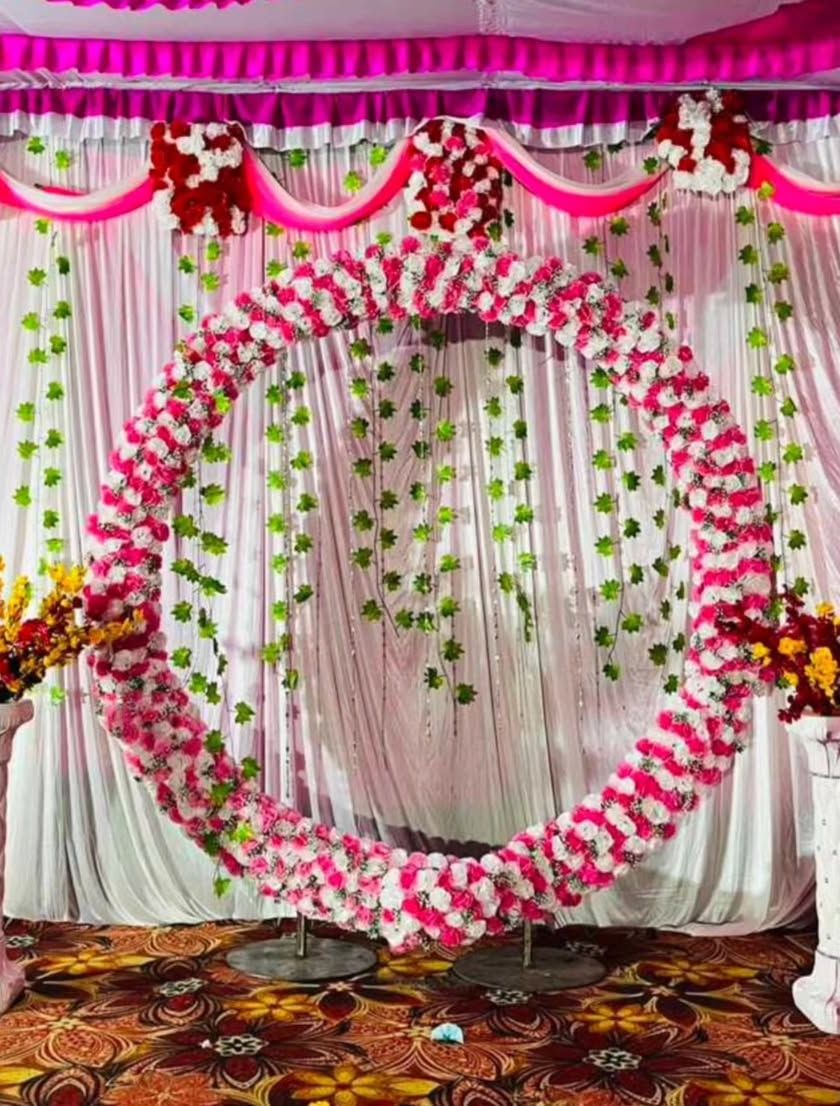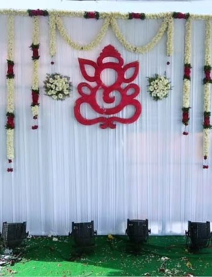 Beyond modern balloon setups, I also provide traditional decorations for festivals and religious functions. This includes floral arrangements like circular backdrops for Ganesha habba and stage decor using classic flower garlands.