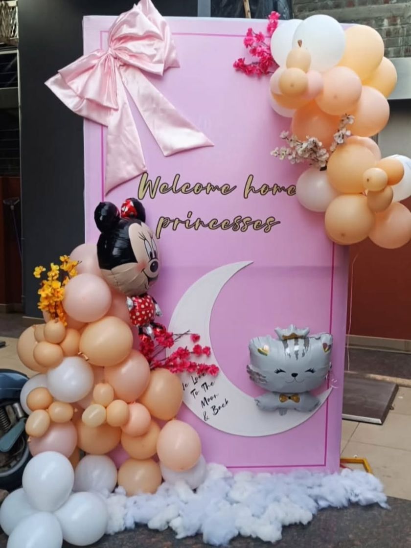 Celebrate the arrival of your little one with a special setup. I offer themed backdrops like the "Welcome Home Princesses" design, as well as full room decorations with balloons and custom elements to make the moment memorable.