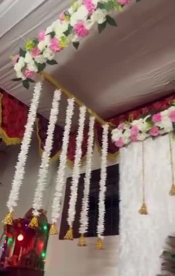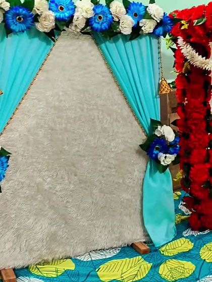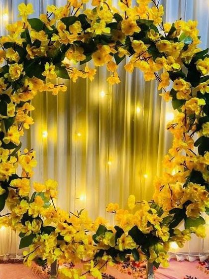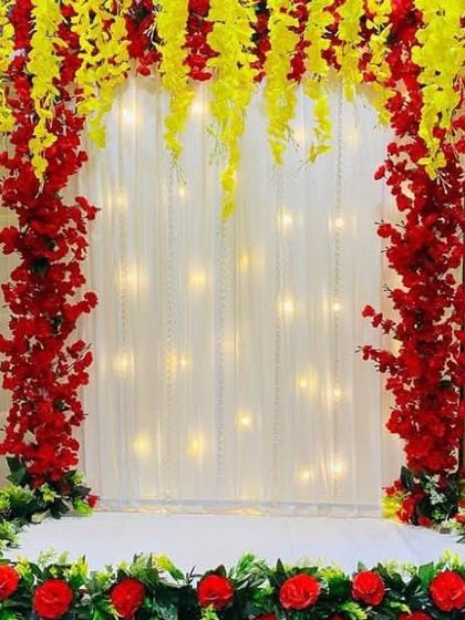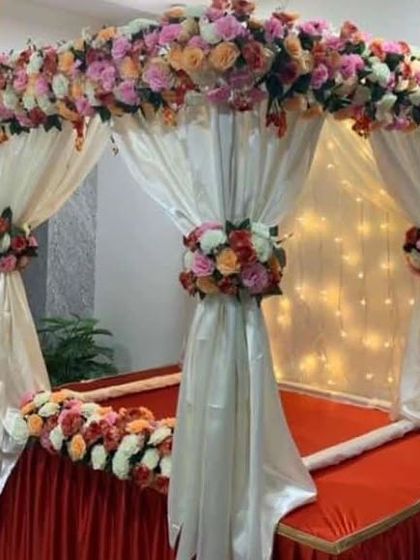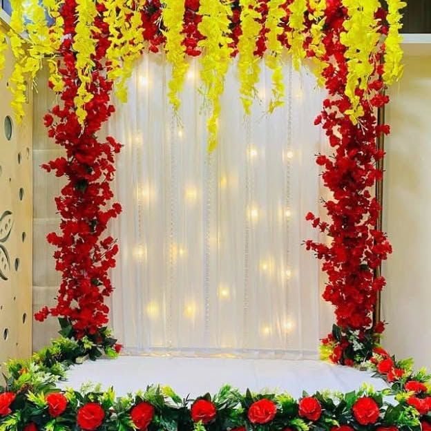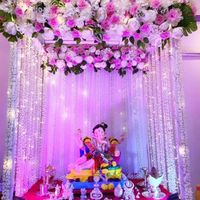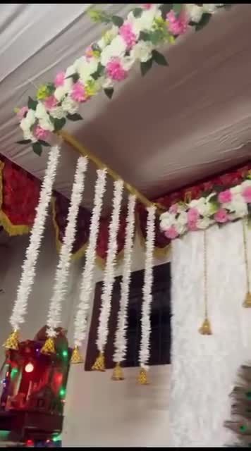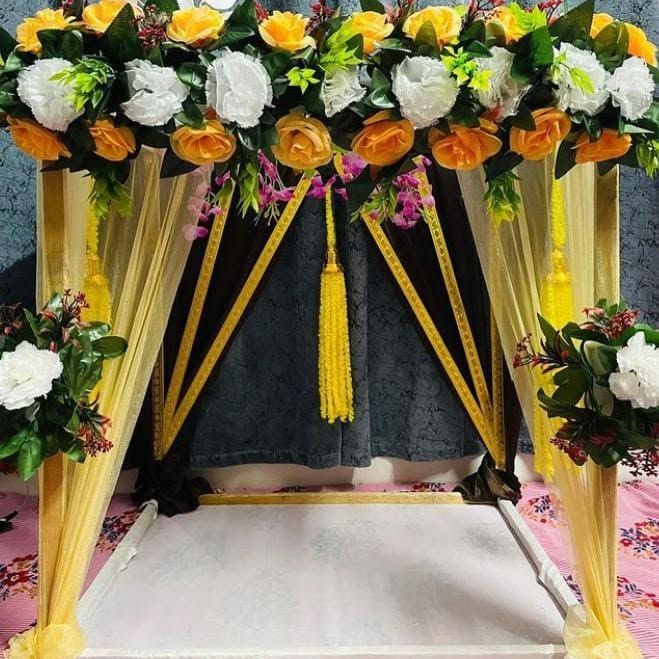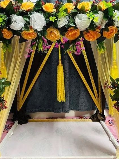 This is my most popular service for home Ganpati celebrations. I create beautiful four-post canopy mandaps using high-quality fabrics and lush artificial flowers, available in a wide range of colors like yellow, pink, and multi-color combinations to match your vision.