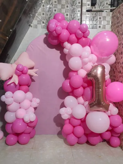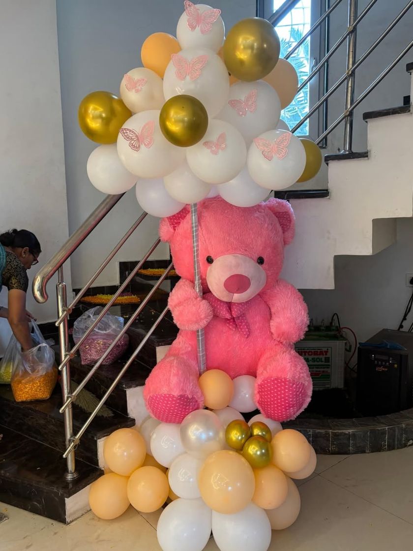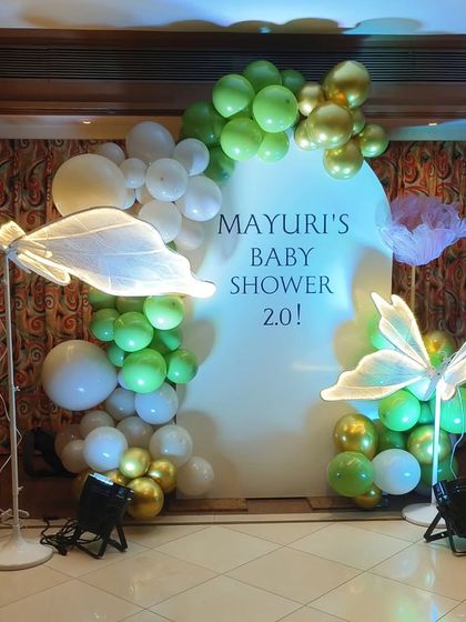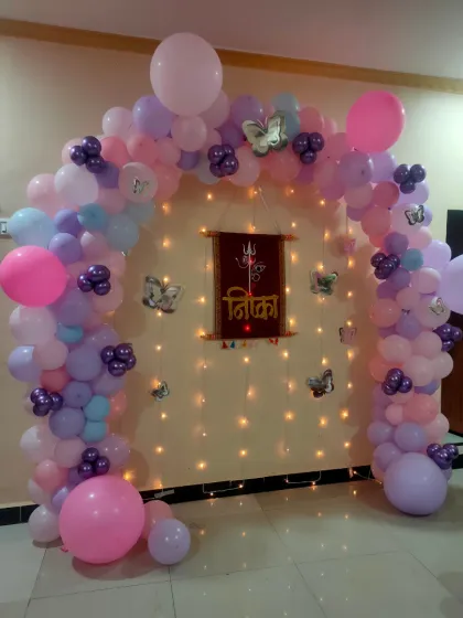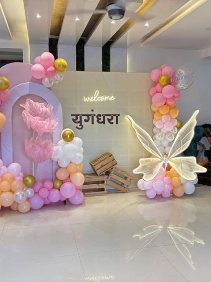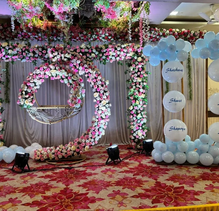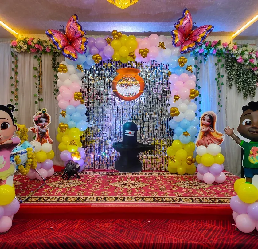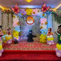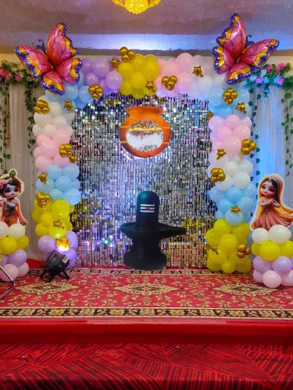 For the special naamkaran ceremony, we focus on creating a beautiful focal point around the baby's cradle (palna). We offer full stage backdrops with custom name signage and can incorporate both floral and balloon elements.