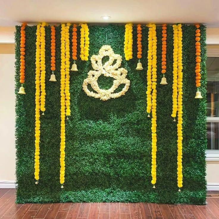 For a more classic or traditional event, we specialize in decorations using fresh or artificial flowers. We create stunning floral backdrops, cradle decorations, entrance pathways, and green walls with custom elements like a Ganesha motif.