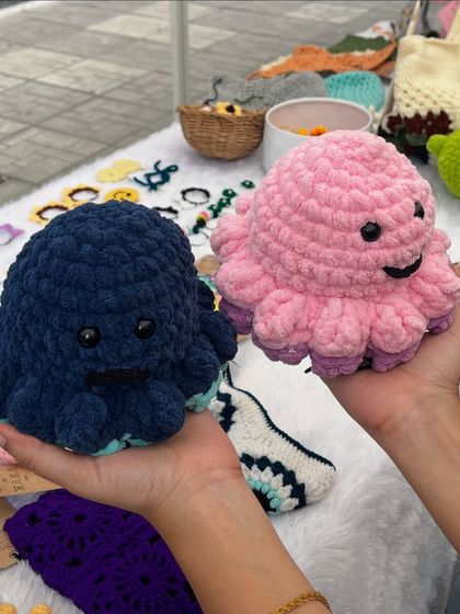 I create soft and squishy crochet plushies that are perfect for cuddling or gifting. My most popular design is the reversible octopus, which can flip between a happy and a sad face, but I'm always open to creating other cute characters.