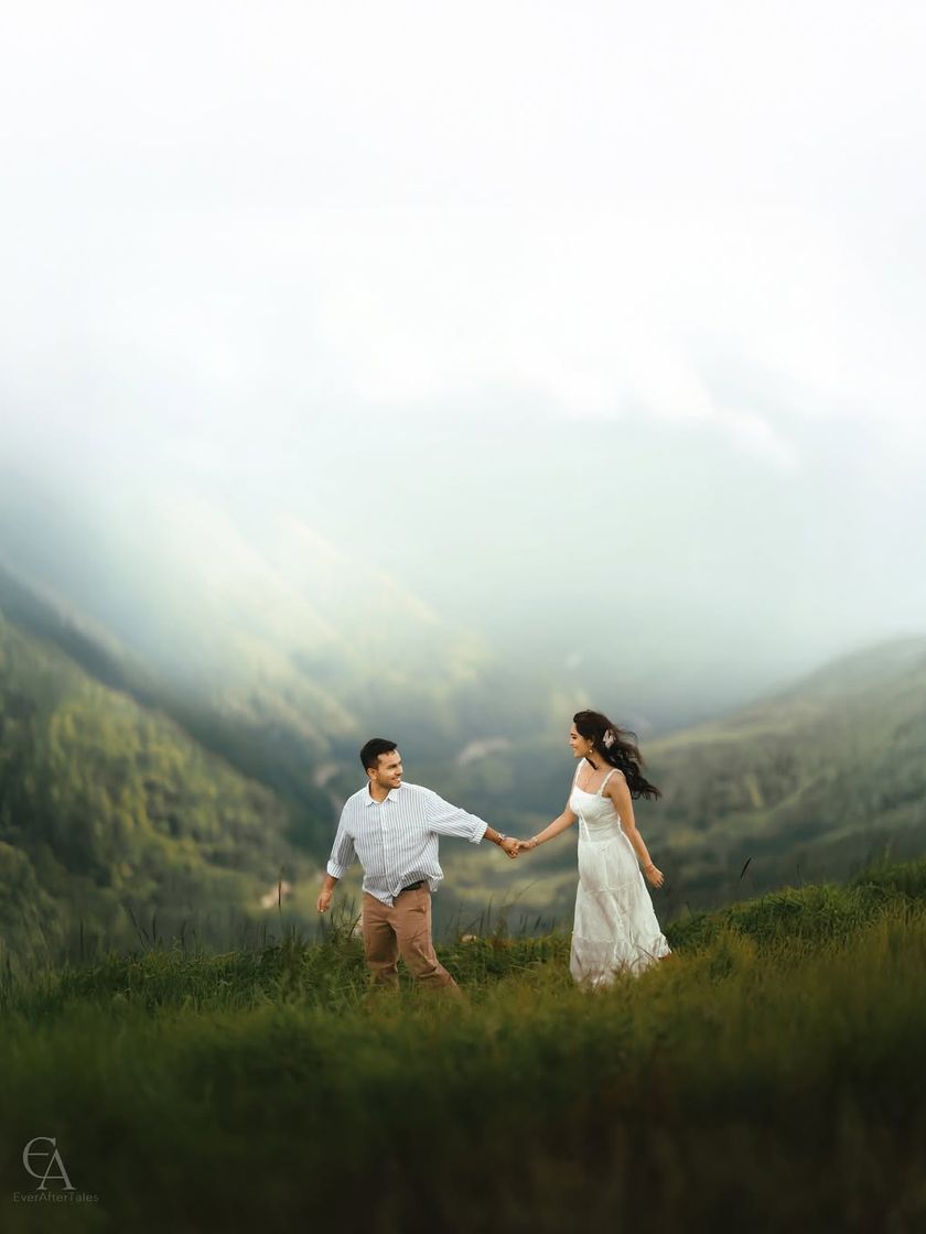 I help couples find vast, open landscapes with misty mountains and dramatic skies for their pre-wedding story. These sessions focus on capturing both grand, scenic portraits and spontaneous moments of joy as you explore the wilderness together.
