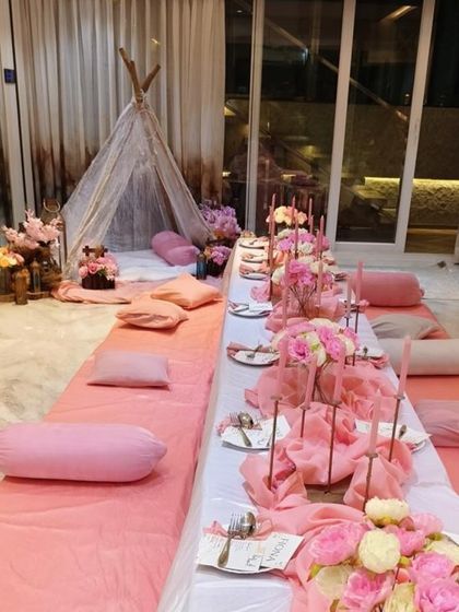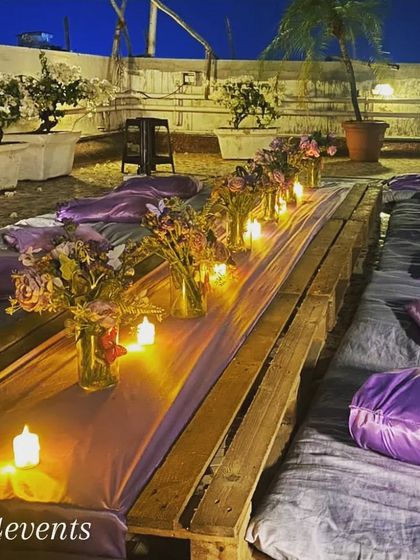 We create trendy and comfortable low-seating arrangements for a relaxed, bohemian vibe. These setups are ideal for bridal showers, birthdays, or a casual get-together with friends, featuring low pallet tables, plush cushions, and unique decor elements.