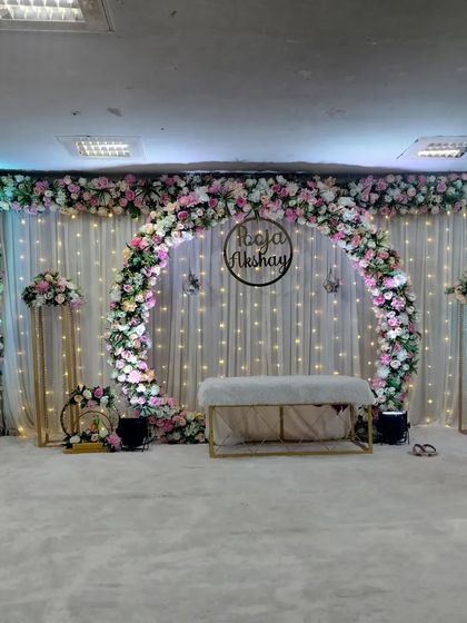 - Backdrop: 16ft to 20ft wide setup featuring a Heavy Floral Arch or Artificial Green/Flower Wall.