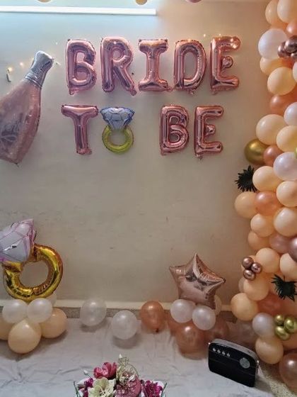 For cozy events, I do bride-to-be balloon garland setup, ring-shaped balloons, and Haldi with marigold garlands, yellow drapes, umbrellas.