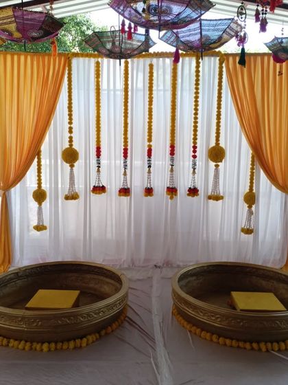 We bring energy and color to your Haldi and Mehendi ceremonies. For Haldi, we offer everything from traditional marigold and umbrella setups to modern sunflower themes. For Mehendi, our trendy green walls with custom neon signs are perfect for your photos.