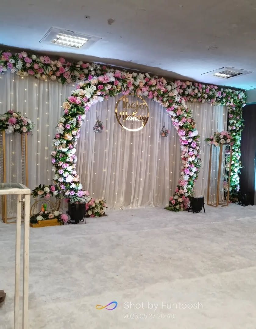 Function kontahi aso, we create the perfect stage for your ring ceremony. We offer a variety of setups from grand floral arches with fairy lights to elegant drape backdrops, all personalized with custom name hoops to make the decor uniquely yours. We ensure top quality work that fits within your budget.