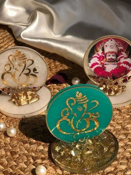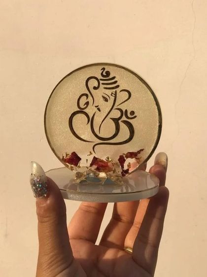 We craft intricate resin Ganesha stands, customizable in any color of your choice. Each piece measures 2.5 to 3 inches and features delicate gold detailing, making them perfect decorative pieces.