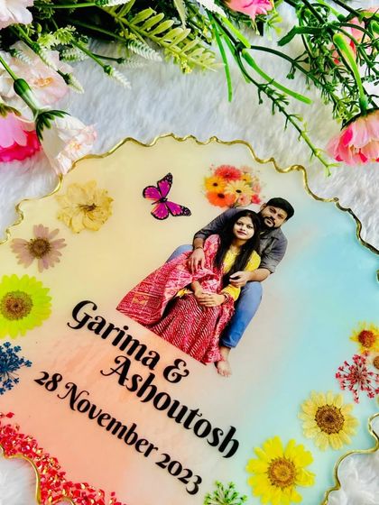Capture your special moments in elegant resin plaques. Each piece is handmade, preserving real dried flowers alongside your photos, names, and dates for a unique keepsake. I also create mini resin stands perfect for return gifts or small tokens of appreciation.