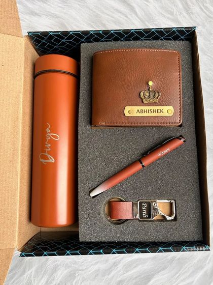 If you’re thinking all-in-one, I do curated gift sets in premium boxes. These can have a diary, card holder, pen, keychain, or even temperature bottles mixed in. The leather hampers are a hit, especially with wallets, sunglass holders, and passport covers - all matching, all personal.