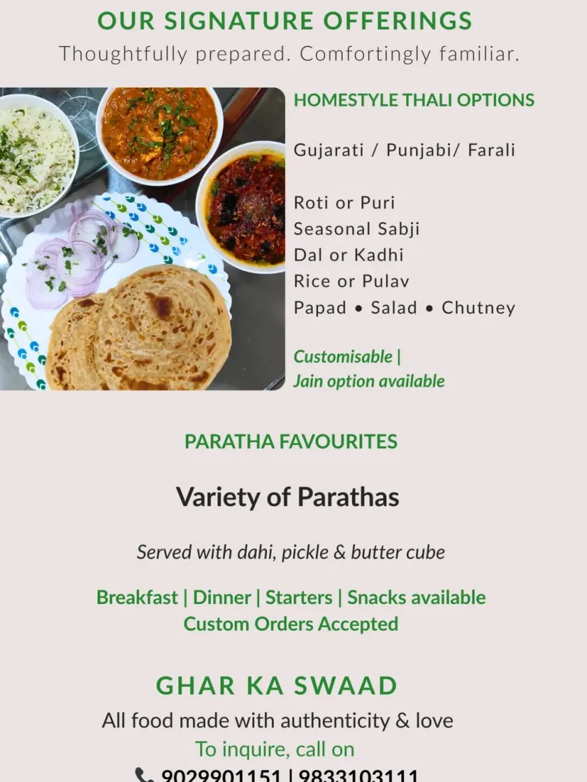 This is a quick look at my most popular meal options. I offer complete homestyle thalis with choices like Gujarati and Punjabi, as well as a variety of parathas perfect for any meal of the day. Jain options are always available on request.