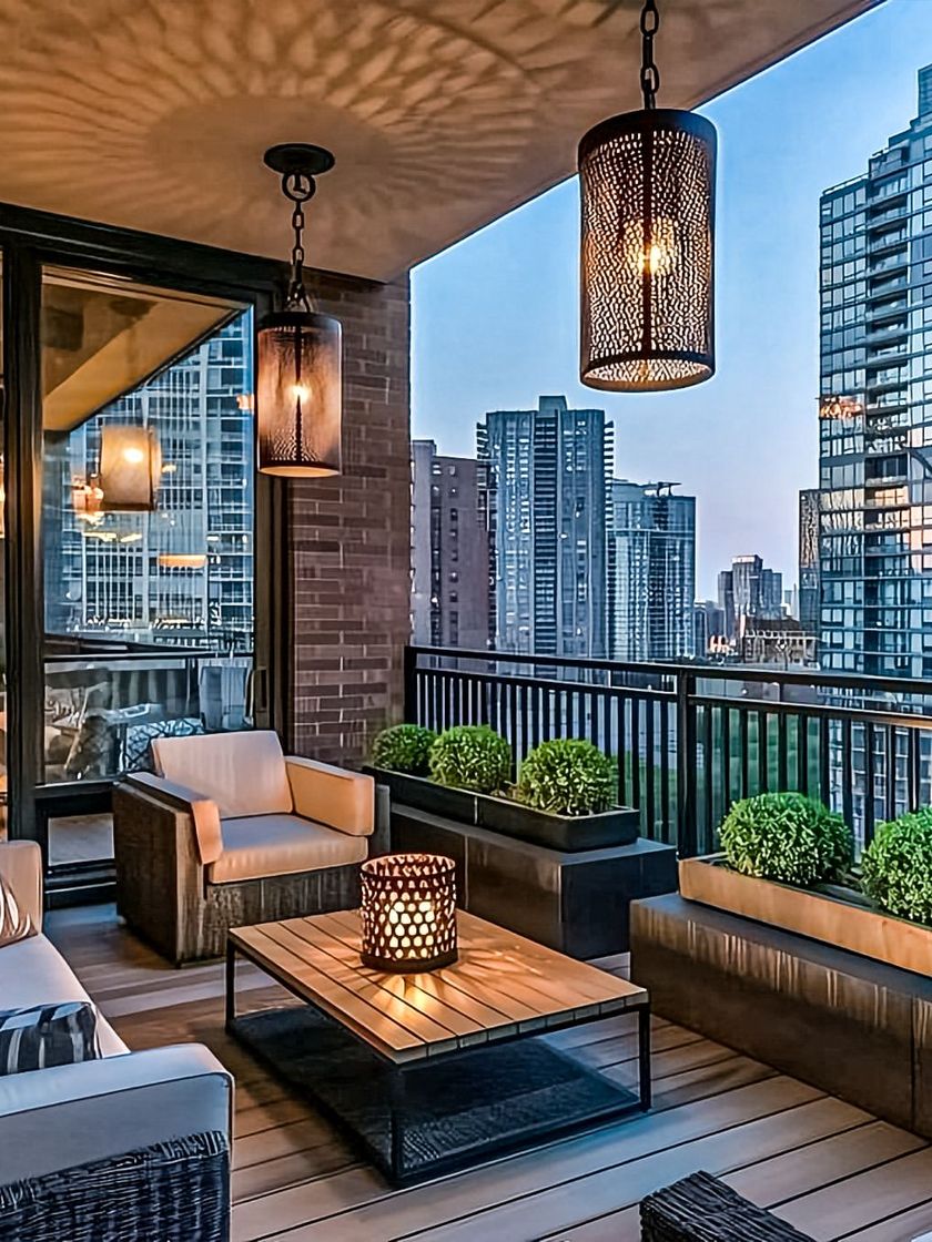 The right lighting transforms a balcony into a magical space after sunset. I use a combination of fairy lights, statement pendants, and subtle backlighting to create the perfect mood for evening relaxation.