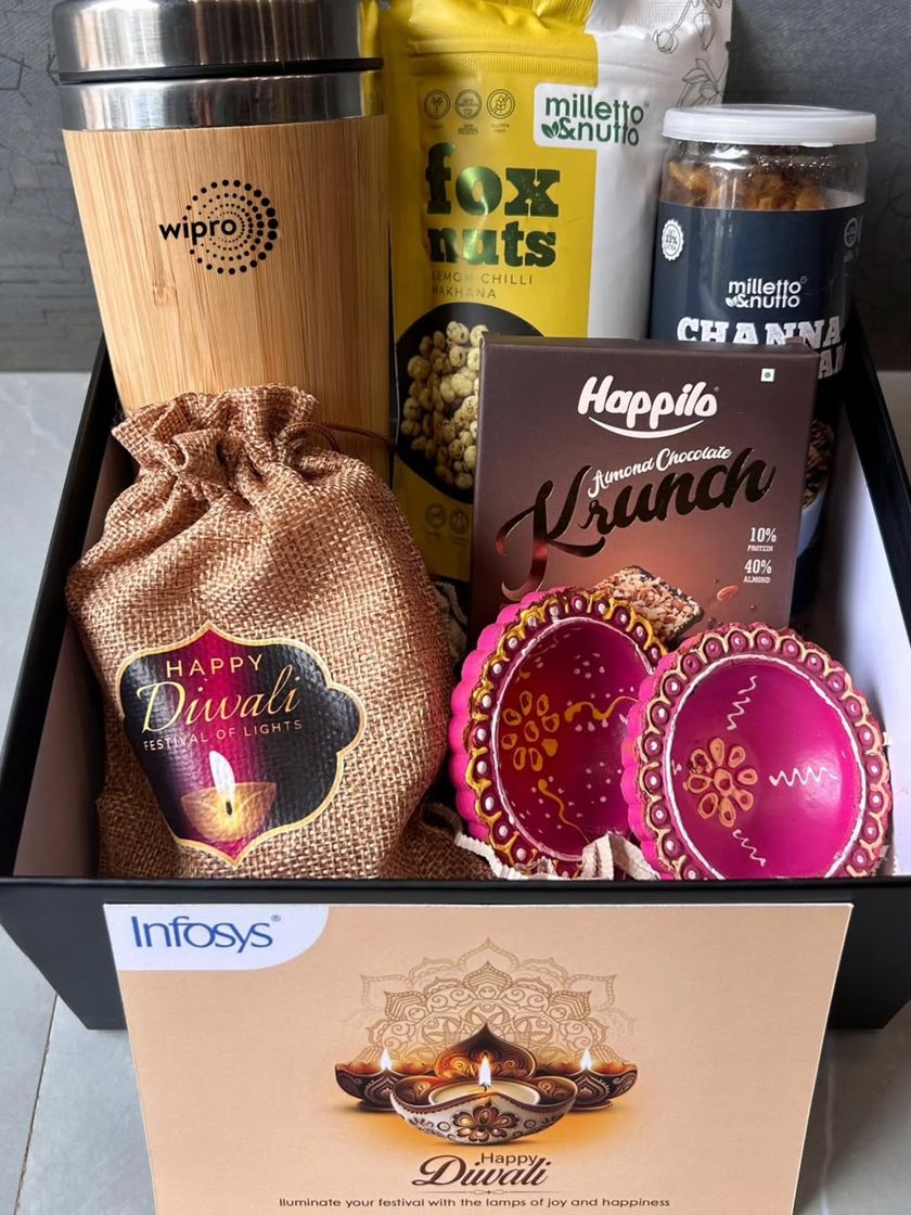 Celebrate special occasions like Diwali with a curated hamper. I combine gourmet treats, festive items, and branded merchandise in a beautiful package, complete with a custom card from your company.