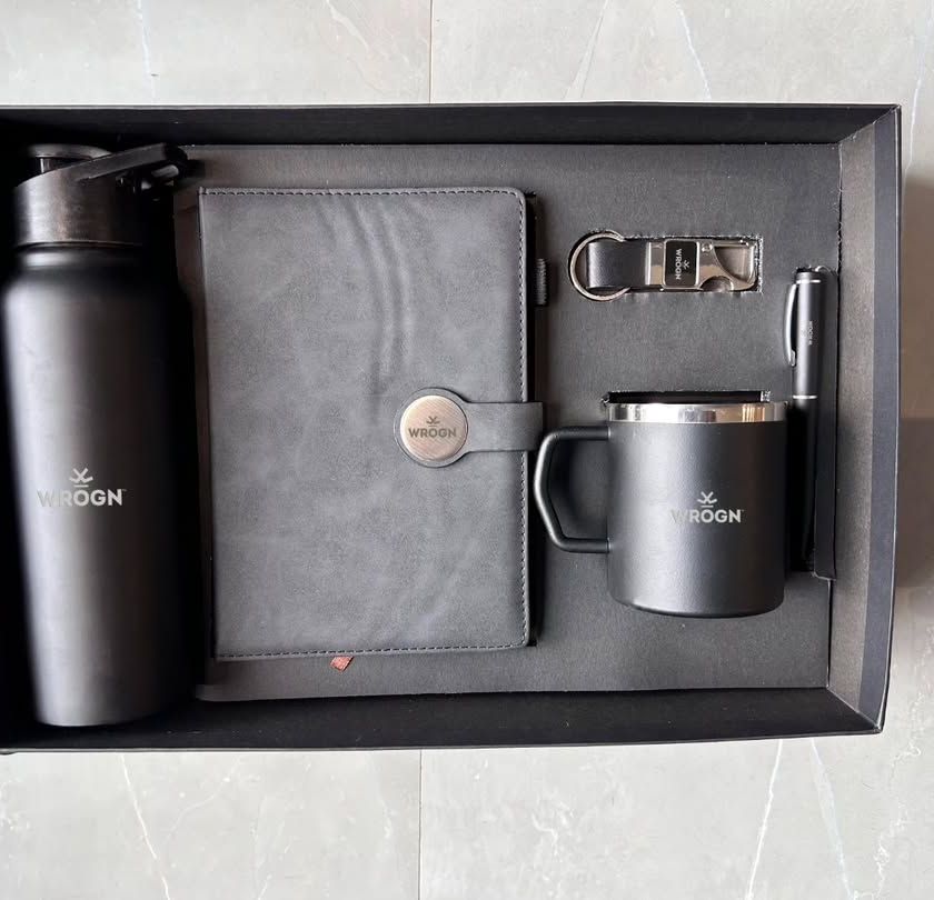 I create practical gift sets perfect for new employee onboarding or corporate events. These kits typically include a branded diary, pen, water bottle, and mug, available in various colors like classic black, professional blue, and elegant cream and brown.
