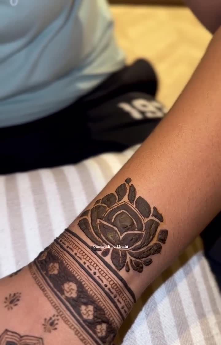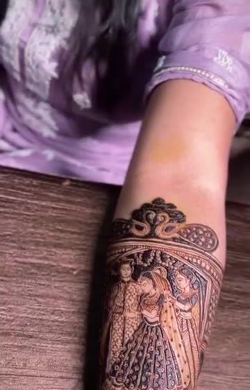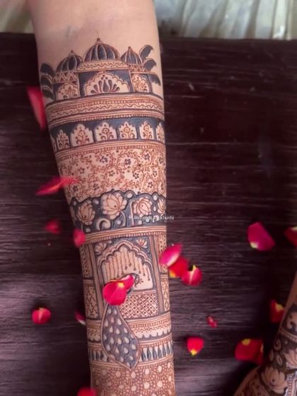 For the classic bride, I create elaborate designs filled with traditional motifs like peacocks, elephants, lotuses, and palace architecture. My focus is on fine lines, detailed shading, and a balanced composition that extends beautifully up the arm.