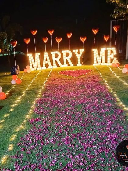 - Romantic proposal setup with giant ‘MARRY ME’ letters, rose petal pathways, candles, and cold pyro sparklers.