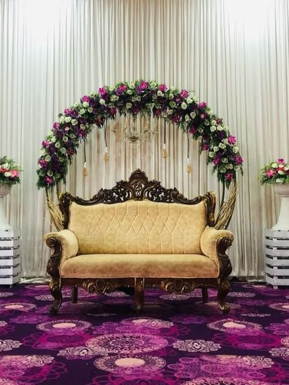 I create beautiful and photogenic backdrops for your engagement or ring ceremony. I offer designs ranging from classic floral arches with ornate seating to modern, personalized setups with custom welcome signs.
