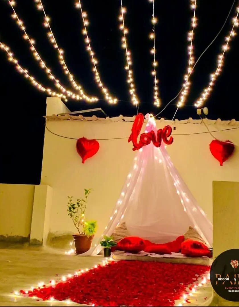 For more private celebrations, I design cozy and romantic setups perfect for a special date night, anniversary, or a quiet proposal. These include fairy-lit canopies and beautifully decorated terrace settings with rose petal pathways.