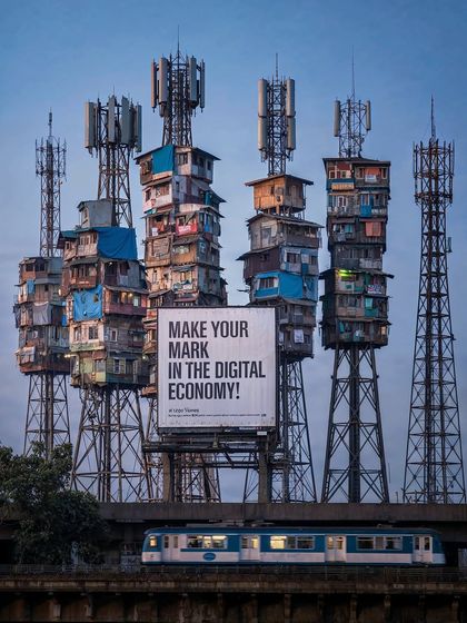 This concept visualizes a dystopian solution to urban overcrowding where slums are built vertically on massive communication towers. It's a commentary on social mobility and the digital divide, exploring what life looks like when the only way to go is up.