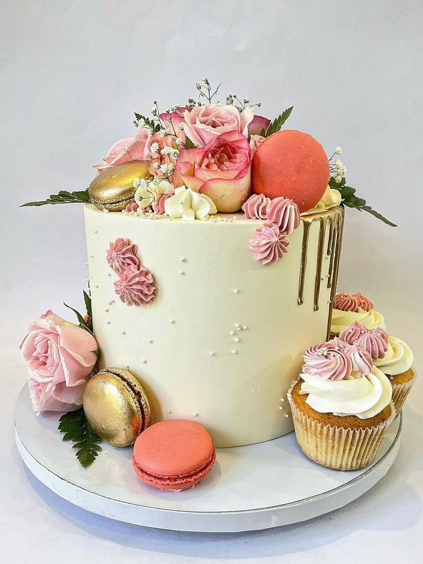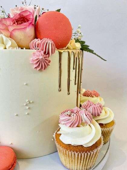 Perfect for anniversaries, milestone birthdays, or any sophisticated celebration. I specialize in buttercream cakes adorned with fresh flowers, delicate macarons, and artistic touches like gold drips, paired with matching floral cupcakes.