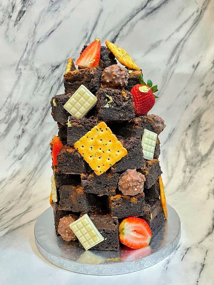 Beyond the cake, I create unique dessert towers and individual treats that make a statement. This includes my popular Lotus Biscoff brownie stack, custom-decorated cookies, and luxurious chocolate bon-bons perfect for party favors.