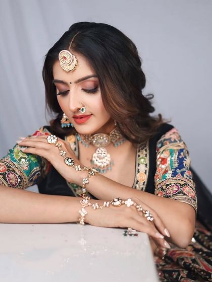 - Hand & Ear: Heavy Jhumkas with Sahara support chains to prevent ear drooping, plus a pair of Hathphool (hand harnesses).