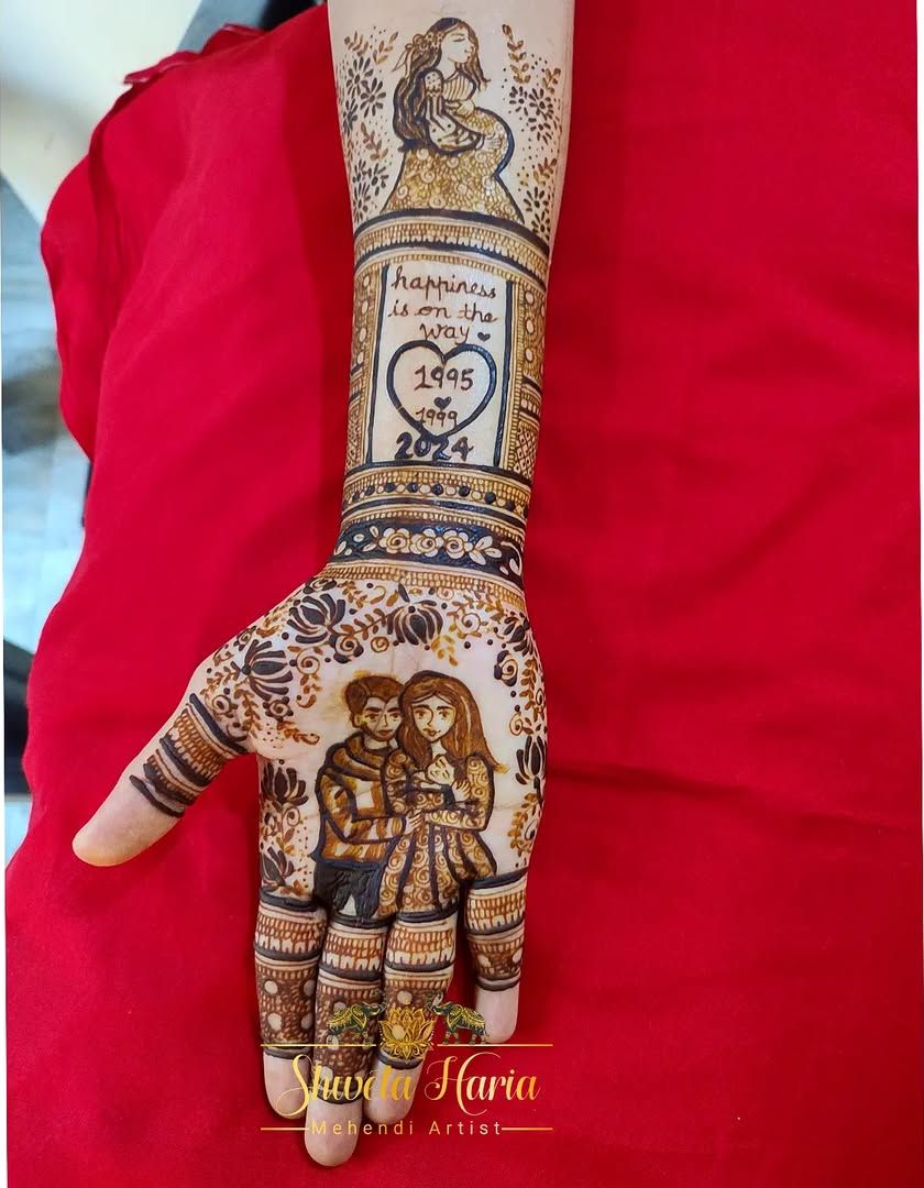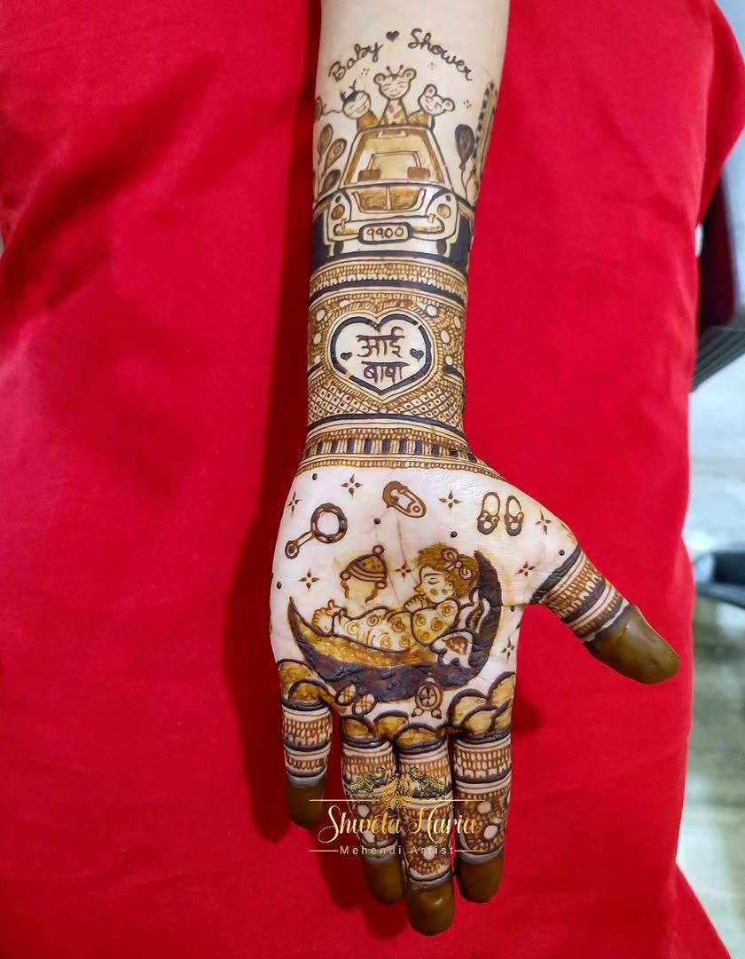 Celebrating the journey to motherhood is one of my favorite things to do. I create custom mehendi for baby showers, or 'godh bharai', that tells the story of your growing family, incorporating elements like baby portraits, footprints, toys, or heartfelt messages like 'Aai Baba'.