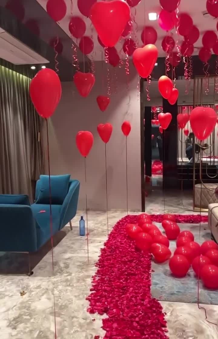See how I turn an entire space, whether a hotel room or your bedroom, into a romantic escape. I use a combination of ceiling balloons, floor balloons, and rose petal pathways to create a completely immersive experience, available in different color palettes from classic red to elegant silver and white.