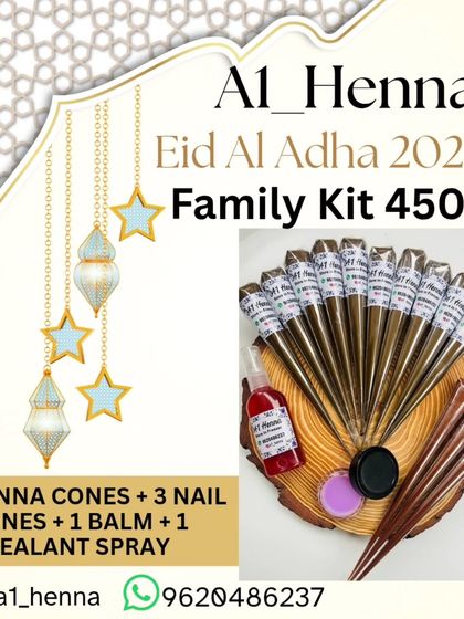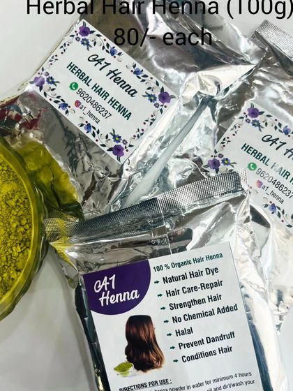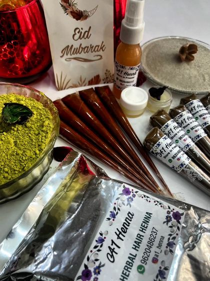 I make and sell 100% natural, halal henna cones and supplies that I use for my own bridal clients, including options for quick stains, hair, nails, and aftercare.