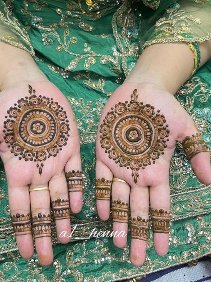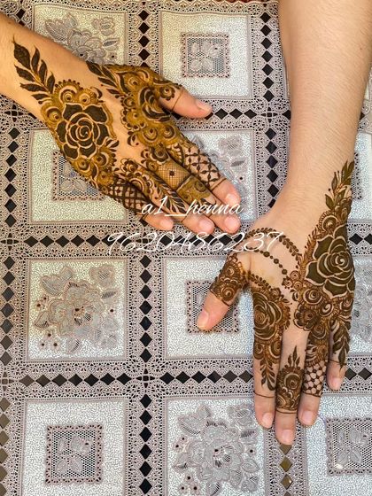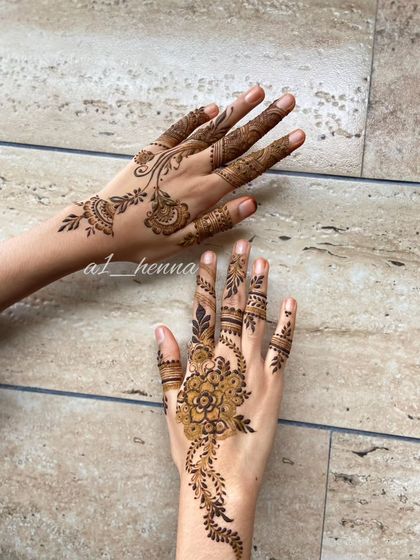 I use my own organic henna cones to create custom designs for weddings, festivals, and parties, with options for deep or quick stains and styles to match your occasion.