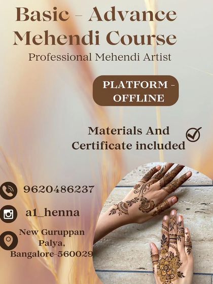 I teach practical mehndi art in-person at my Bangalore studio, covering basics to advanced styles, with hands-on practice and a certificate at the end.