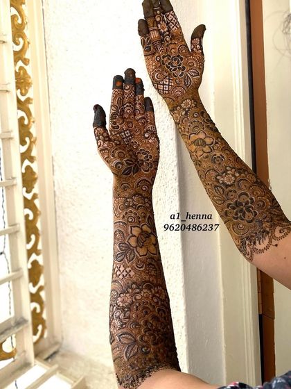 Your wedding day deserves the most exquisite details. I specialize in creating dense, full-coverage bridal designs that adorn your hands and arms, using 100% organic henna for a deep, long-lasting stain. We can incorporate personal elements like initials or symbols to make your bridal mehndi truly yours.
