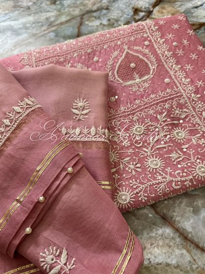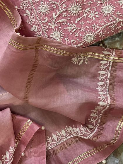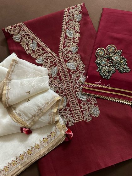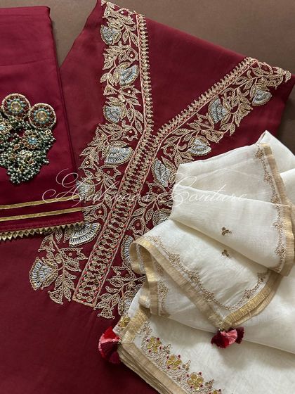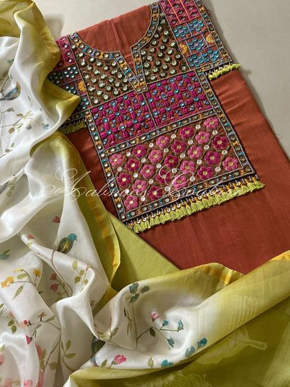We craft exquisite Chanderi kurta sets featuring intricate Marodi embroidery on pure Chanderi fabric. Each set includes a hand-embroidered Marodi neckline and is paired with a Chanderi dupatta adorned with gota and aari work.