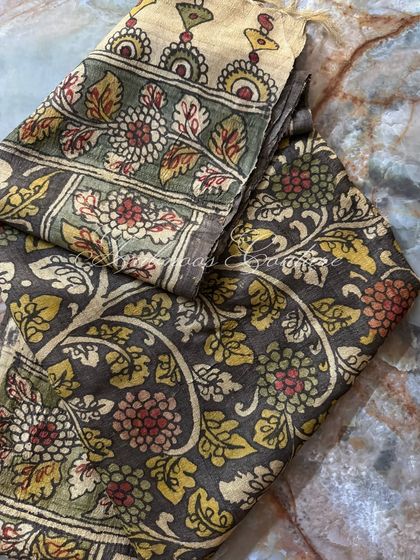 We celebrate the authentic Srikalahasti style of Kalamkari, a freehand drawing and painting tradition that uses a 'kalam' pen and natural vegetable dyes. Each dupatta in this collection is a canvas of mythological tales or nature-inspired motifs, entirely hand-worked to create a timeless piece of wearable art.