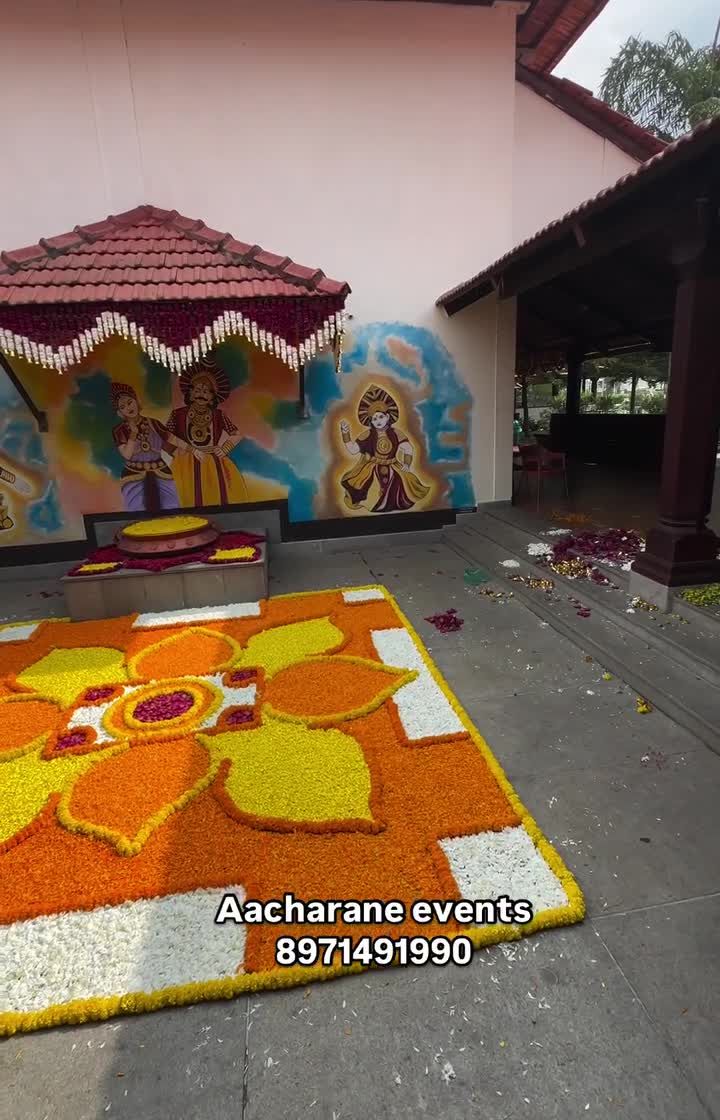 Our team painstakingly creates beautiful, large-scale flower rangolis (Pookalam) and Saptapadi pathways. We use fresh flower petals to design traditional patterns that welcome guests and add a vibrant, artistic touch to the floor space.